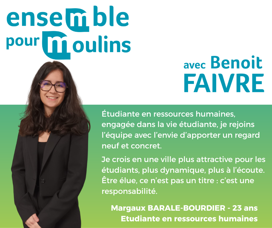 Je m’engage avec énergie, sincérité et envie d’agir. Parce que je suis Moulinoise avant tout, et que je veux contribuer, à mon échelle, à faire avancer ma ville.